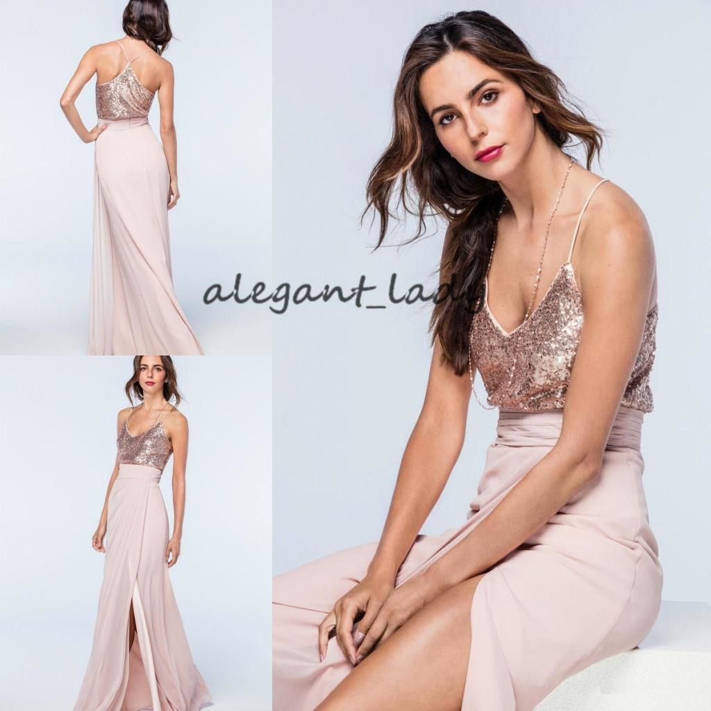 Long Blush Bridesmaid Dresses Top Rose Gold Sequin V Neck Spaghetti Straps Wedding Guest Gowns Sexy Side Split Chiffon Maids Champagne Colored Bridesmaid Dresses Cheap Bridesmaid Dress From Alegant Lady 73 12 Dhgate Com